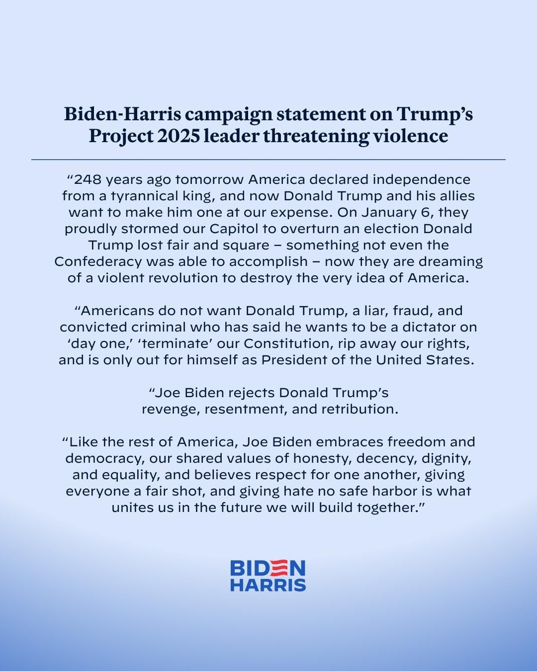 "248 years ago tomorrow America declared independence from a tyrannical king, and now Donald Trump and his allies want to make him one at our expense"