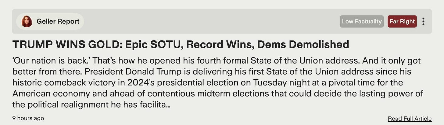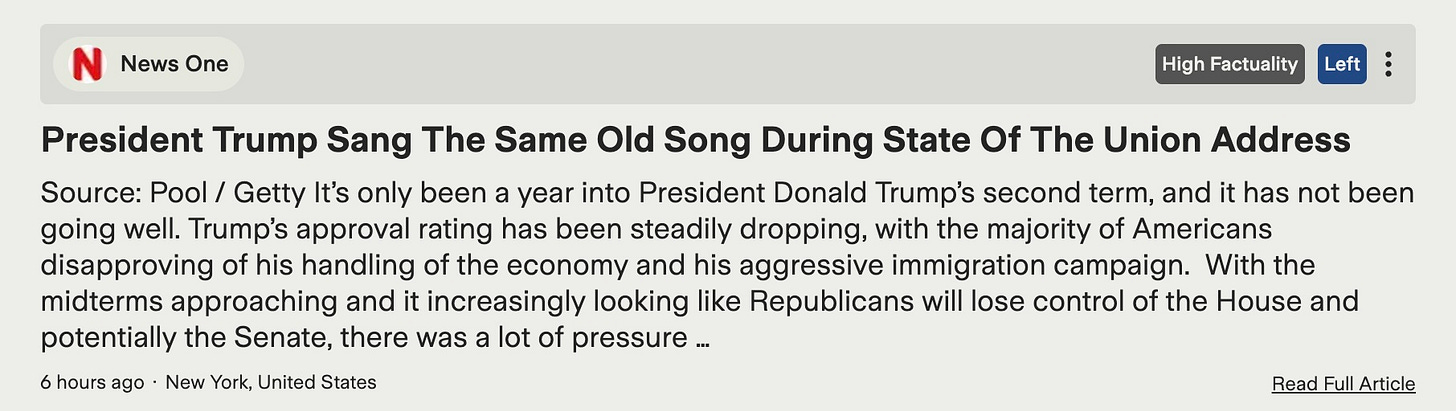 Common Sense Takeaway: This was not only an episode in gaslighting, it was just frankly…boring. His speeches are not captivating—they are monotone—and it sounded like any other campaign speech. It also was chalk full of lies and falsehoods in an effort to make Americans believe that things are better than they are (which never works, by the way). Yet of course right-wing outlets are reporting on the State of the Union like it was a fact-driven success. See this headline: